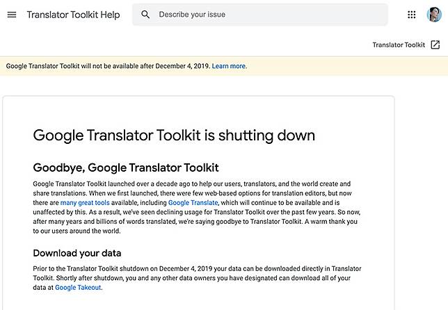 Google Translator Toolkit Shutdown. It uses the Google Translate engine which searches the Internet for accurate translations and applies them to your documents. On Wednesday December 4 Google Translator Toolkit will shut down for good.